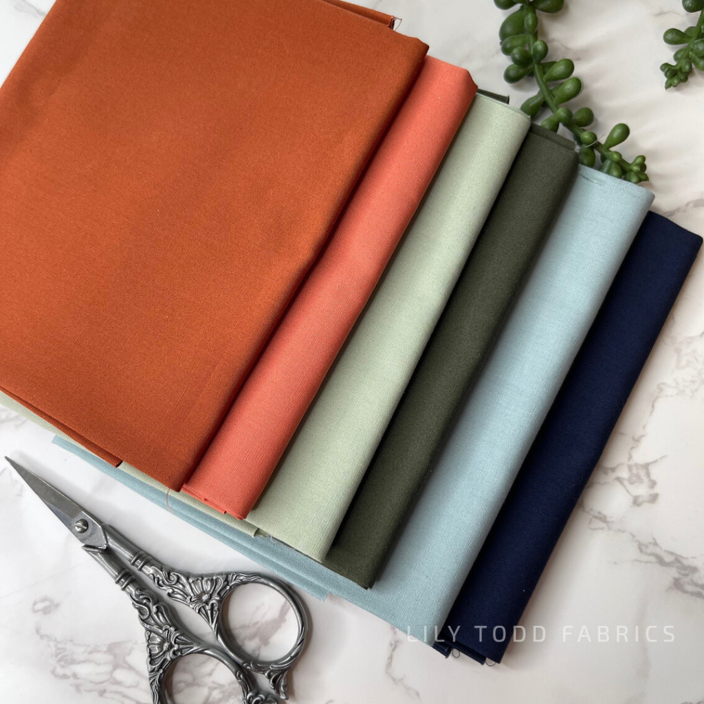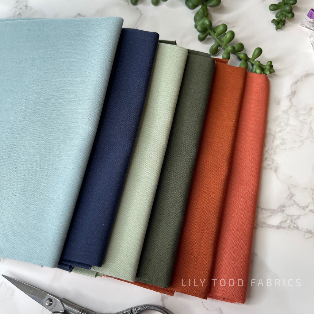 Curated bundle of six solids using Art Gallery Fabrics PURE Solids in Terracotta, Sage, and Navy.